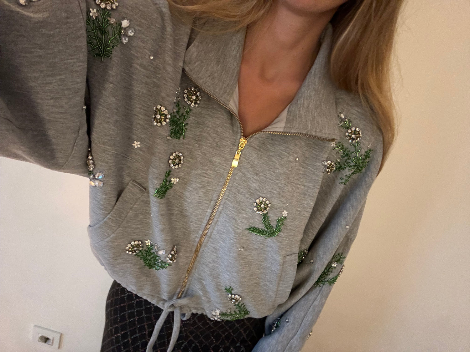 A grey-toned bomber, fully embellished with bejeweled details, adding an elevated touch to your most effortless casual outfit. One size